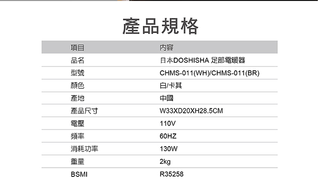首頁 / DOSHISHA / 足部電暖器 CHMS-011 BR(停售)